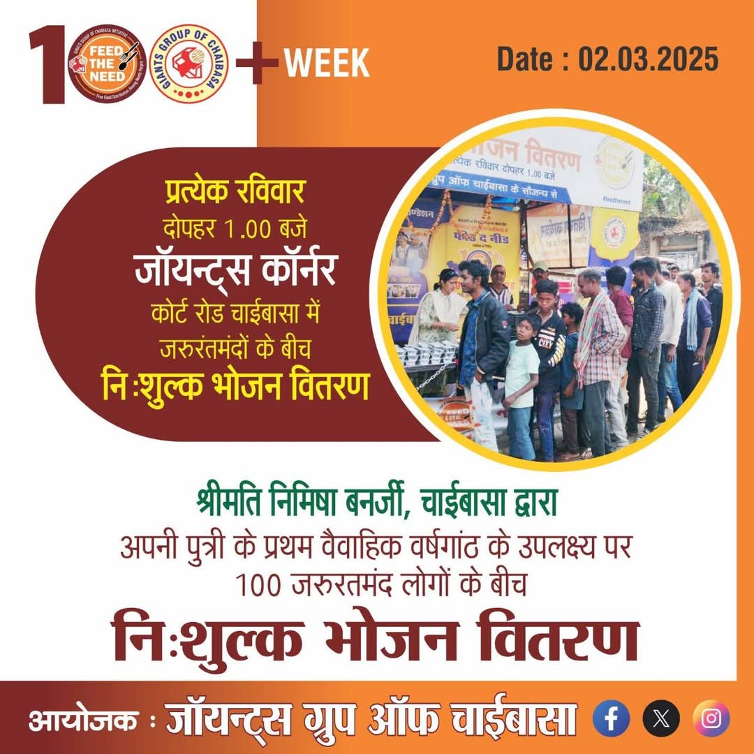As of2nd March 2025, the group has consistently served100 needy individuals every Sunday at 1:00 AMatGiants Corner, Court Road, Chaibasa.